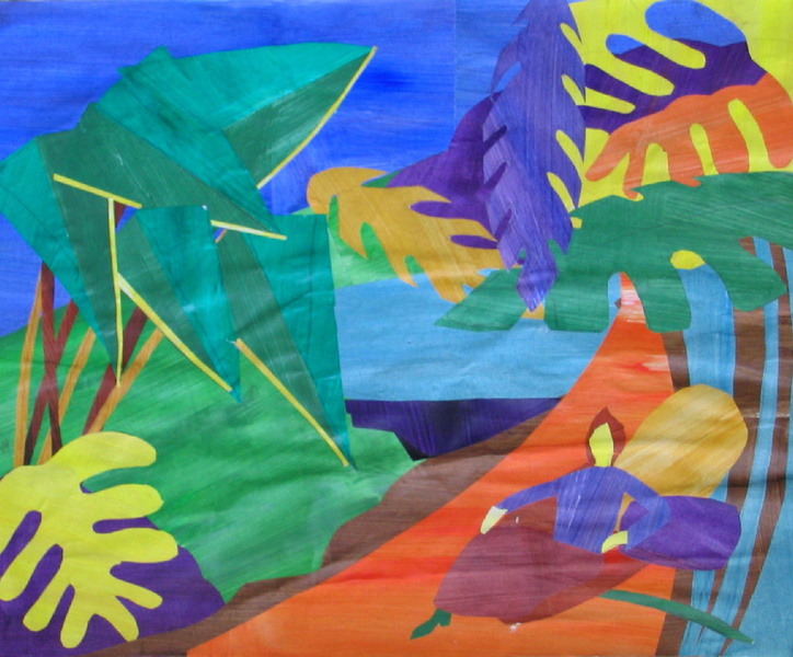 Er moest een collage gemaakt worden, waarbij gekozen kon worden uit 3 thema's. Ik had geen zin en koos wat mij het eenvoudigste leek: "ontmoeting". Na enige voorbereiding plakte ik een ontmoeting in elkaar en vroeg vervolgens aan de studiebegeleidster wat ik verder zou gaan doen. Op dat moment was er nog ruim een uur tijd beschikbaar. Ze wierp een blik op mijn collage en zei vervolgens met enige minachting in haar stem: "Dat ding is nog helemaal niet af." Op mijn vraag wat ik er aan moest doen antwoordde ze: "Weet ik dat, het is jouw collage!" Toen heb ik m'n verstand op nul gezet, wat plakkaatverf gepakt en heb ik wat kleuraccenten op de collage aangebracht. Met het heilige voornemen het ding aan het eind van de avond weg te gooien. Dat heb ik echter niet gedaan, omdat ik het resultaat eigenlijk wel leuk vond. Dus heb ik m'n collage mee naar huis genomen om er verder aan te knutselen. Ik ben heel gelukkig met het eindproduct.